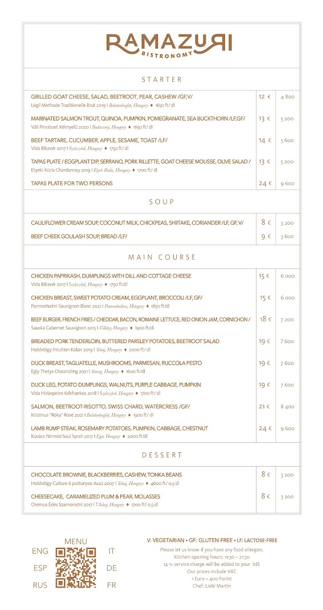 Welcome to Ramazuri Bistronomy, a charming haven nestled in Budapest's Úri u. 30. This delightful bistro captures the essence of Hungarian cuisine with offerings that are both hearty and flavorful. Renowned for its goulash and chicken paprikash, each dish is a testament to traditional cooking, enveloped in a cozy atmosphere perfect for a laid-back dining experience.